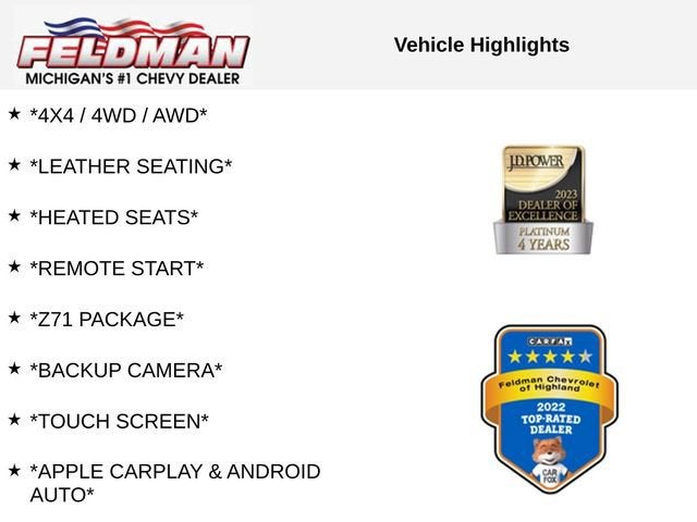 *4X4 / 4WD / AWD*, *LEATHER SEATING*, *HEATED SEATS*, *REMOTE START*, *Z71 PACKAGE*, *BACKUP CAMERA*, *TOUCH SCREEN*, *APPLE CARPLAY & ANDROID AUTO*, *Bluetooth®*, *4G LTE WIFI / ONSTAR*, *SATELLITE RADIO SIRIUS XM*, *LOCAL TRADE*, *LOW MILES*, *VEHICLE LOCATED AT FELDMAN CHEVROLET OF HIGHLAND CALL (248) 889-3232*, *GENERAL MOTORS AWARD TOP CUSTOMER SERVICE DEALERSHIP IN METRO DETROIT*, 4WD.